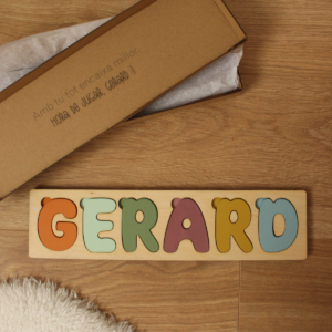 Un puzzle de madera personalizado con el nombre de tu peque. Cada letra encaja y se convierte en un juego que fomenta la psicomotricidad y creatividad mientras decora con ternura su habitación.
