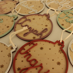 Bola de Navidad personalizada en madera natural. Un adorno único para dar un toque especial al árbol estas fiestas.