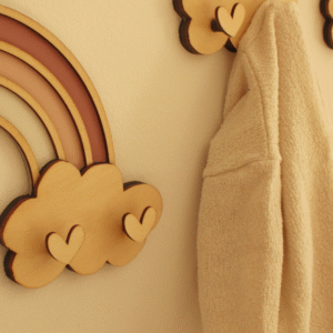 Colgador de ropa artesanal en forma de arcoíris, elaborado en madera natural. Perfecto para decorar y organizar la habitación infantil con estilo y dulzura.
