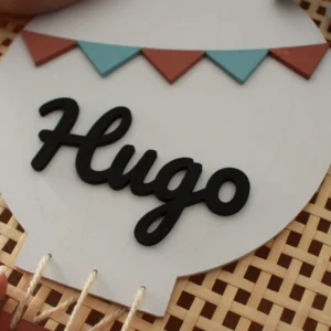 Decora con encanto con nuestra placa de madera personalizada con globo aerostático. Hecha a mano en madera, con el nombre en relieve y detalles en tonos terracota y azul.