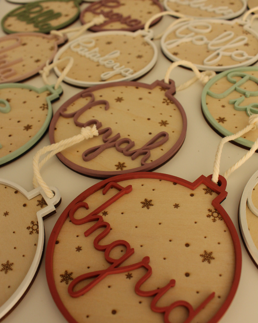 Bola de Navidad Copos de Nieve personalizada en madera natural. Un adorno único para dar un toque especial al árbol estas fiestas.