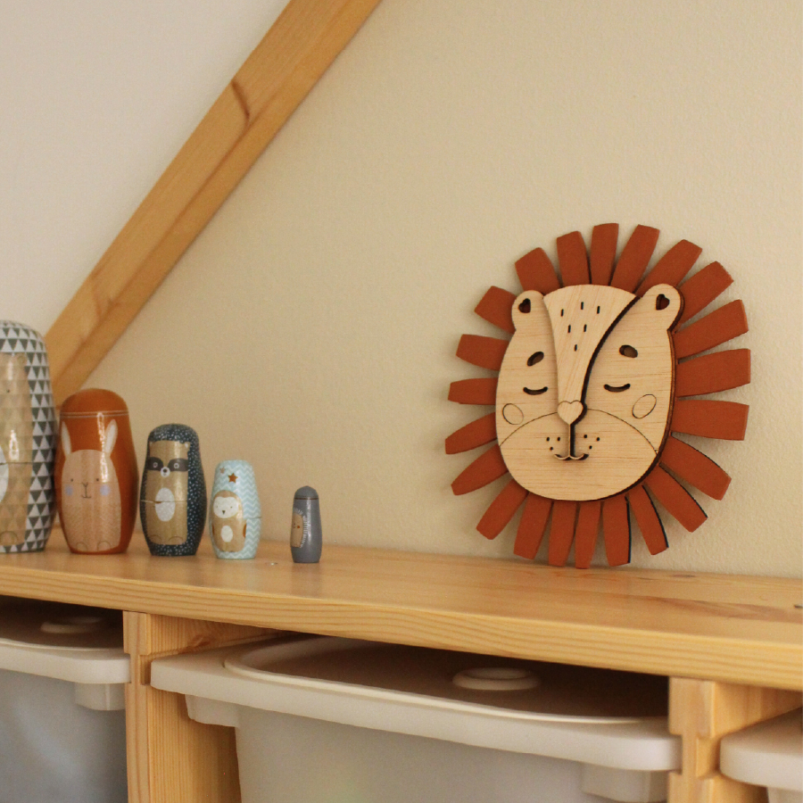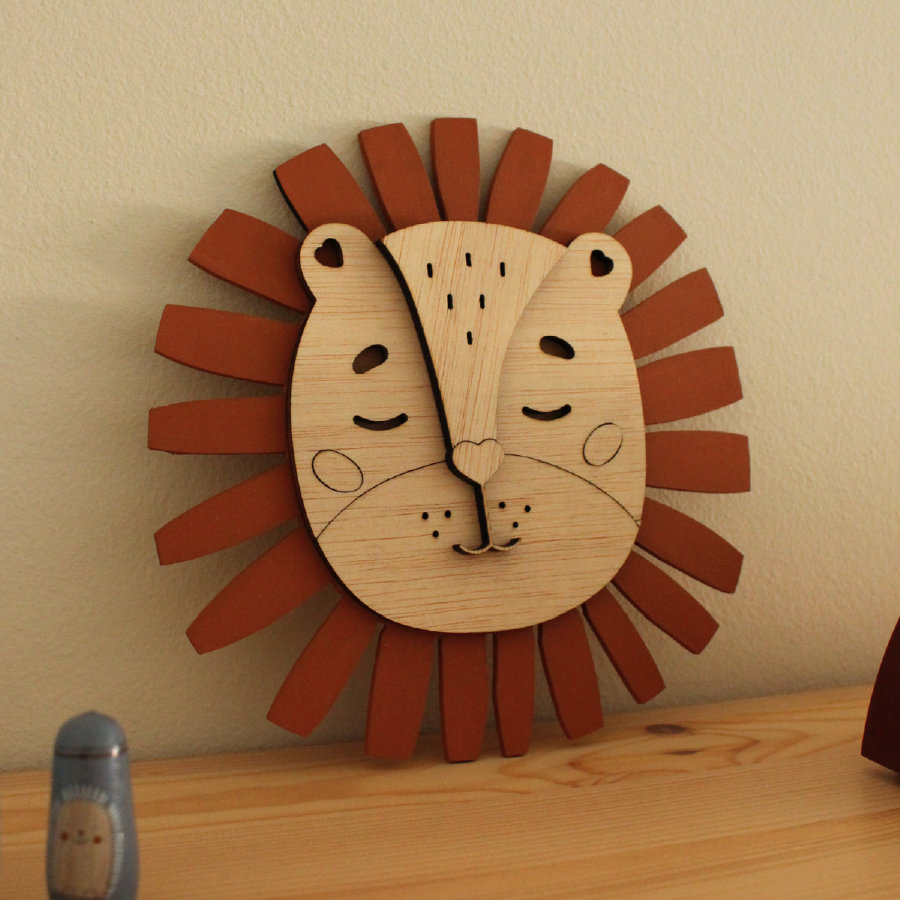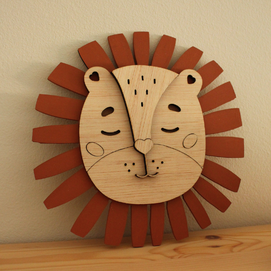 Cabeza de león de madera natural, pintada a mano con melena terracota. Perfecta para decoración infantil, fotos o como regalo artesanal único.