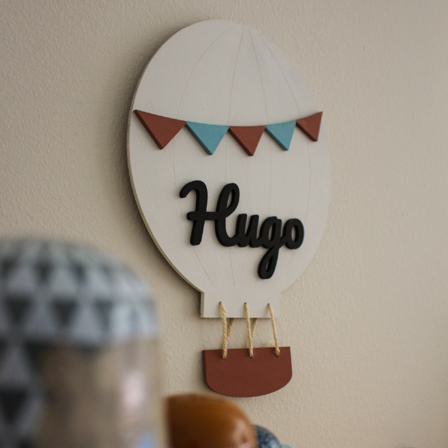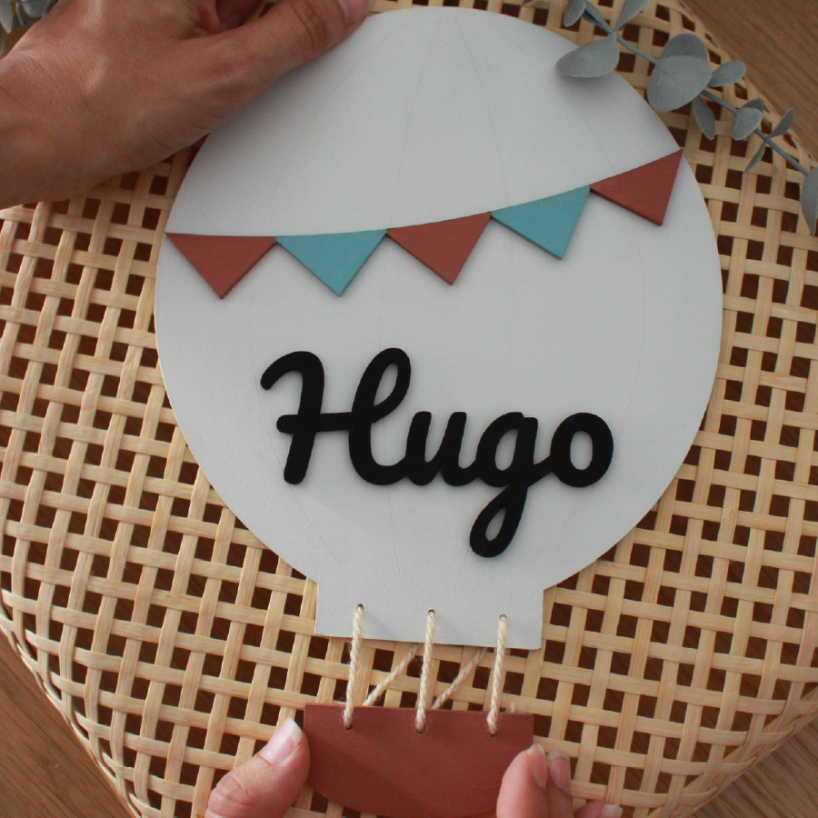 Decora con encanto con nuestra placa de madera personalizada con globo aerostático. Hecha a mano en madera, con el nombre en relieve y detalles en tonos terracota y azul.