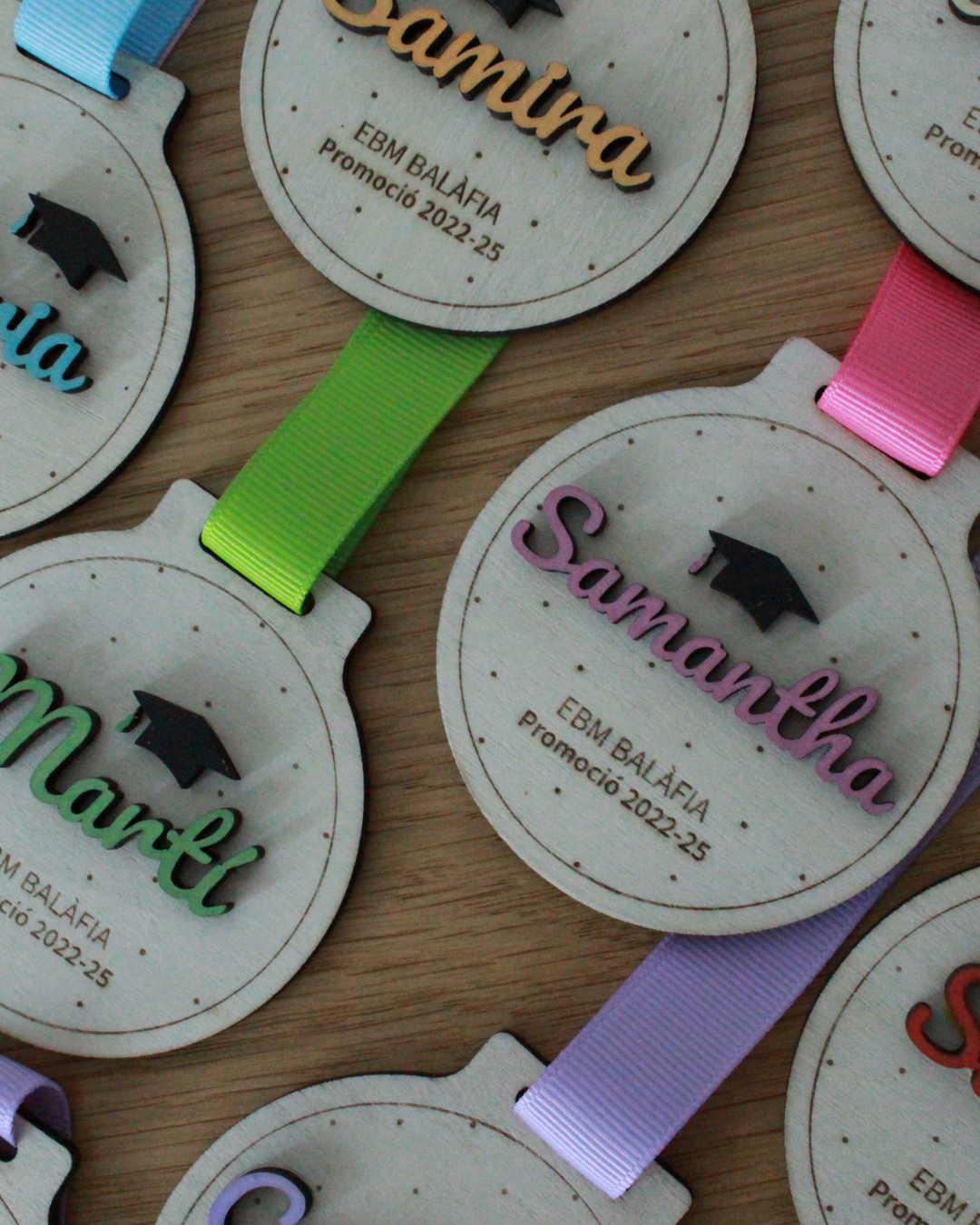 - Medalla madera + Cinta para colgarla cómodamente o colocarla como adorno decorativo.