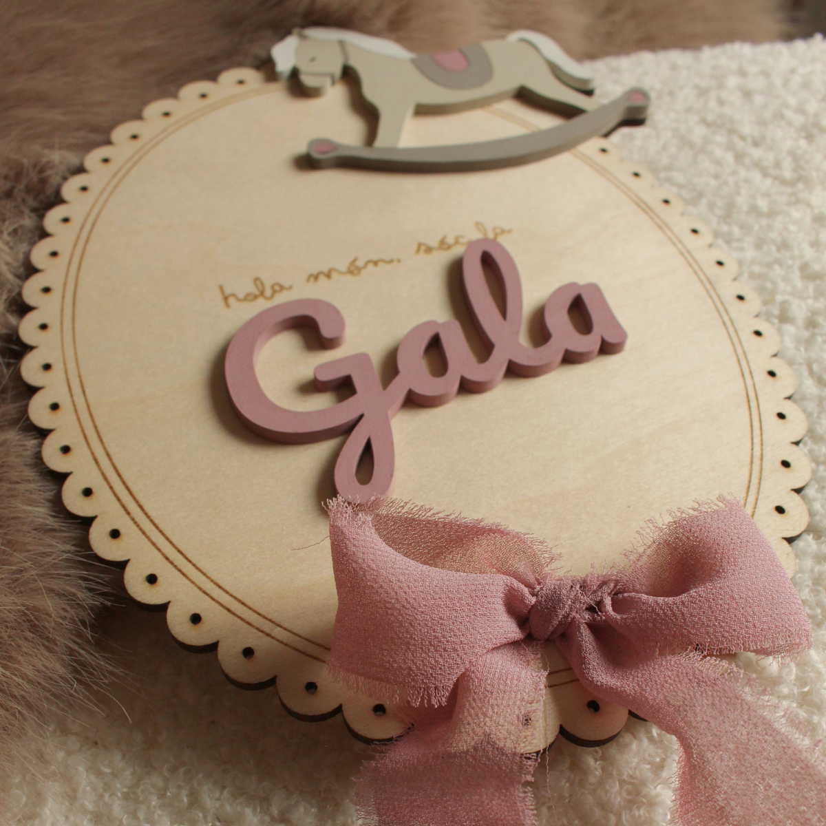 Da la bienvenida a tu bebé con la Placa de temática de Caballo, hecha en madera y personalizada con nombre. Perfecta para fotos en el hospital o primeros días, recuerdos y regalar.