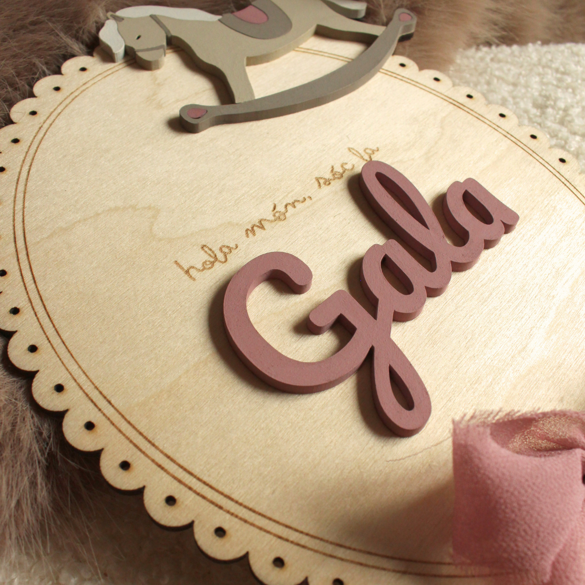 - Placa de bienvenida personalizada con el Nombre del bebé y el mensaje que tú elijas si lo deseas (ejemplo: “¡Hola mundo!”, “Bienvenido”, “Benvingut”,….).