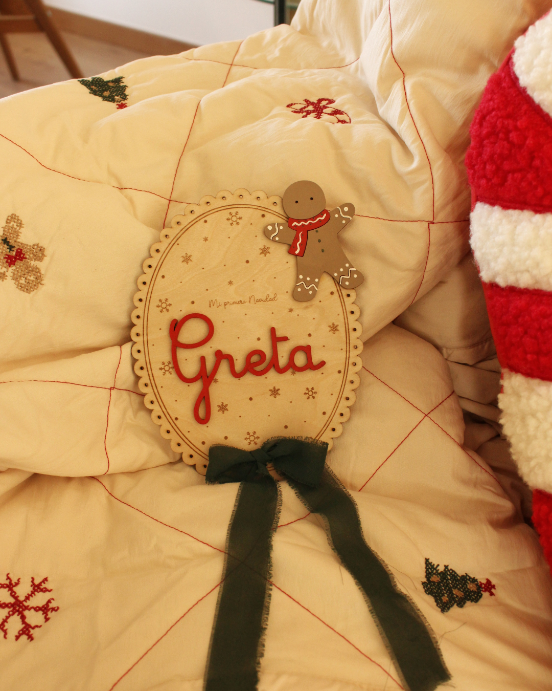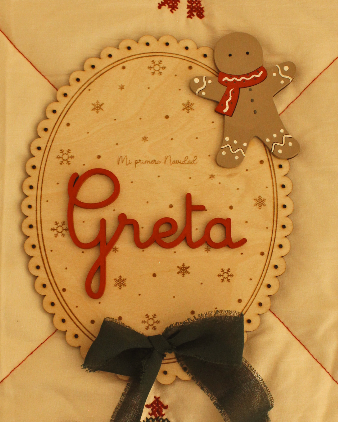 • Placa de bienvenida personalizada con el Nombre del bebé y el mensaje que tú elijas si lo deseas (ejemplo: “Mi Primera Navidad”, «Navidad 2025», «El Mejor Regalo de Navidad»,….).