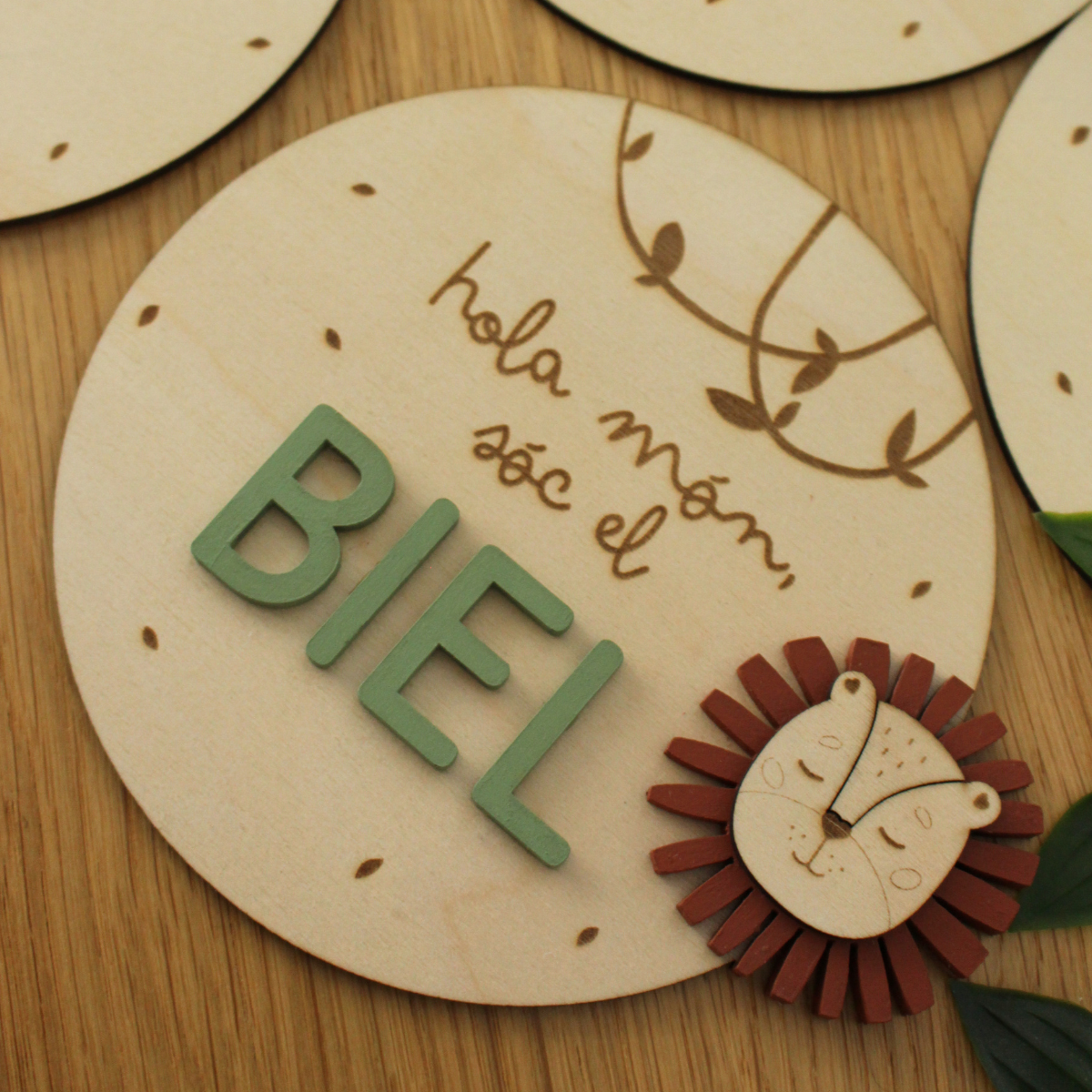 - Placa con nombre del bebé y frase «Hola mundo, soy…» o «hola món soc el…» y con posibilidad de personalizar con el mensaje que tú elijas (ejemplo: “¡Hola mundo!”, “Bienvenido”, “Benvingut”,….).