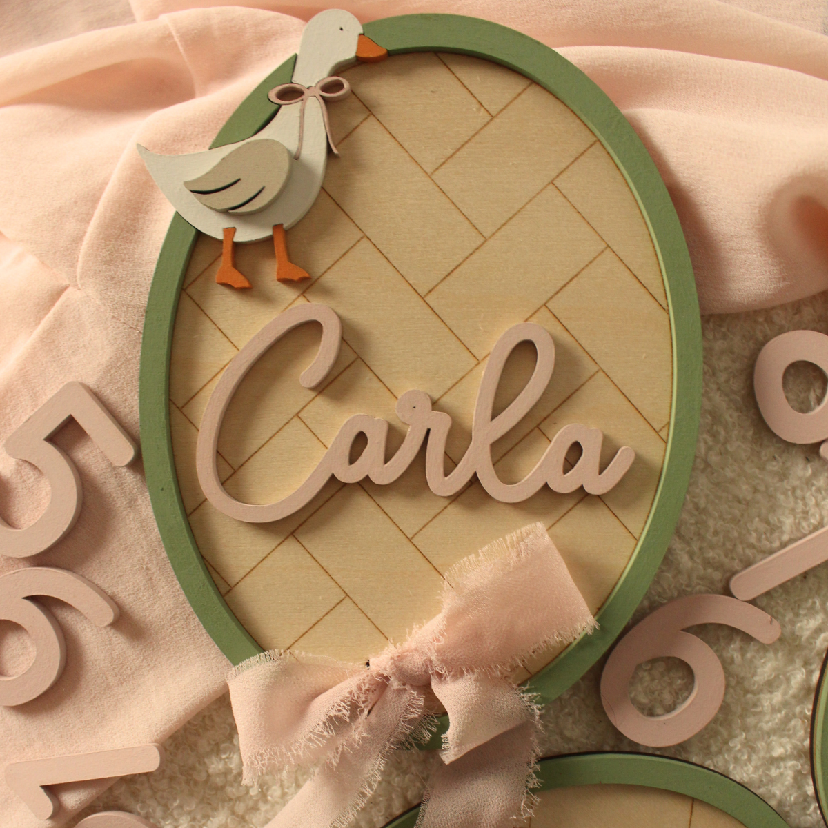 - Los colores de la oca no son personalizables (tan solo se personalizará el lazo a conjunto con el color elegido para el nombre). Se personalizará los bordes de las placas, el nombre, números y la cinta de algodón.